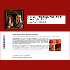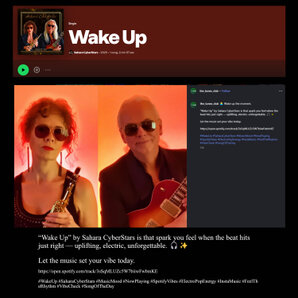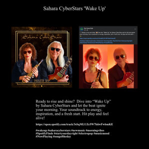Sahara CyberStars "Wake Up" “Wake Up” might sound like a call to action but this is actually a very upbeat jovial song that will have you singing along in no time. Contagious beats with crooning vocals and jazz nuances with an almost lullaby feel that lulls the senses and imbues one with a feeling of yes we can do this! It’s your choice to change your mind if you feel things aren’t right for you and as the chorus says "wake up it’s never too late".